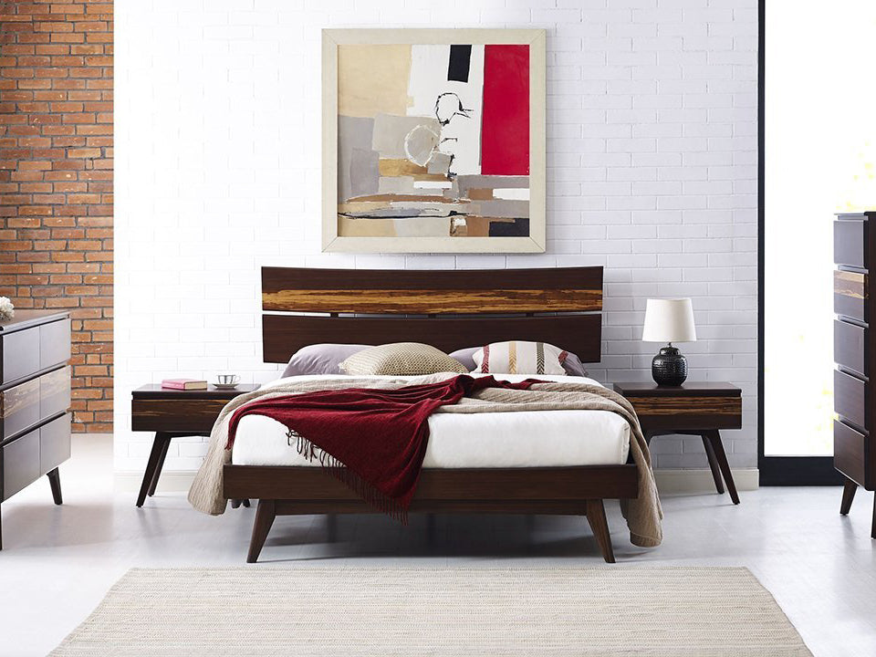 Expertly crafted in earth friendly solid bamboo, the Azara platform bed features sleek styling, clean lines and modern angled tapered legs. The elegant sweeping headboard shows off a beautiful accent panel crafted in solid exotic Tiger bamboo. Completing the bedroom group, the matching Azara bedroom chests each feature a coordinating accent drawer faced in solid exotic Tiger bamboo. Each matching Azara chest is finished on all four sides, has a solid bamboo drawer box, and uses soft close, under mount drawer glides.